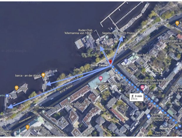 Bei unserem Partner-Café Homely in der Straße Lange Reihe 47, 20099 Hamburg holst du dein Board ab und gibst es dort auch wieder zurück. Die Alster selbst ist nur 270 Meter entfernt und in 5 Minuten kannst du zu Fuß geeignete Einstiegspunkte für deine SUP-Tour erreichen.